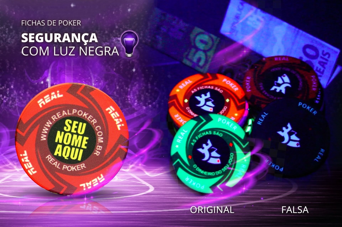 Fichas Totalmente Personalizada Insira sua logo ou desenho, é possível personalizar inclusive a borda da ficha. A arte é feita pela Real Poker sem custo adicional.