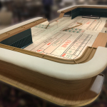 O couríssimo cobre a parte de espuma da lateral da mesa que serve de apoio para os braços. Para um acabamento perfeito, não costuramos, e sim usamos a peça por inteira.